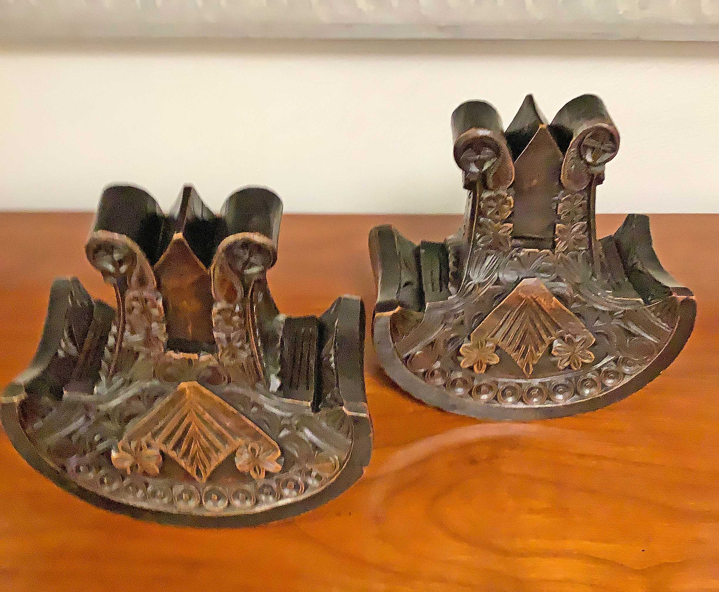 A pair of 19th century Mapuche Ceremonial stirrups engraved with People of the Land symbolism