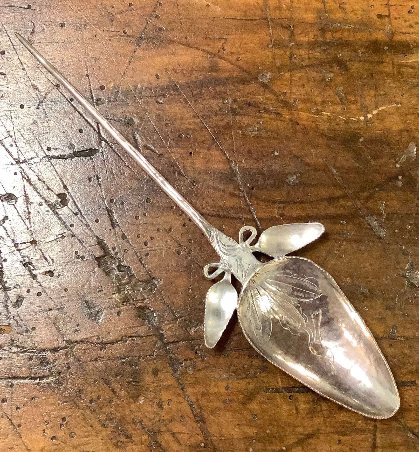 An 18th century Tupu in silver used as a cloak pin and coca spoon
